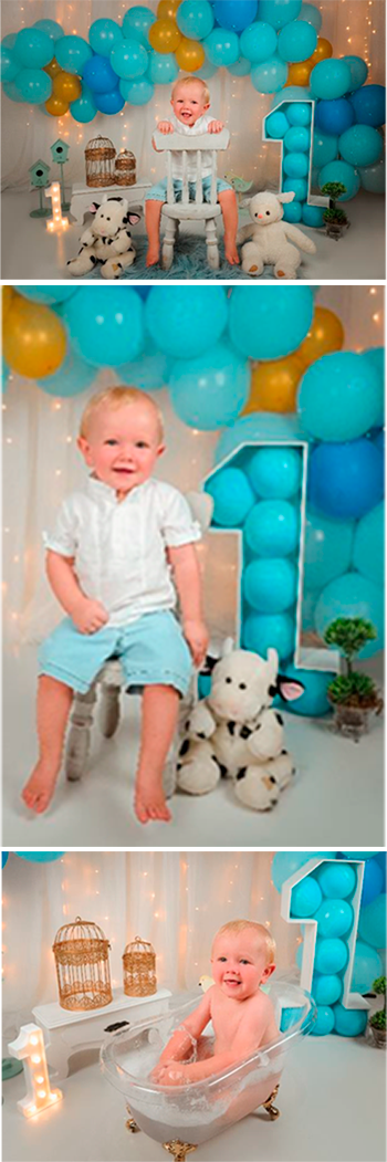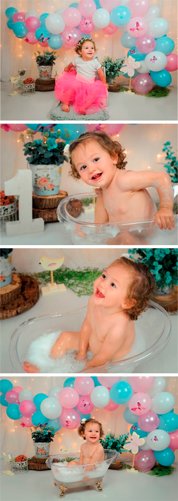 - Ensaio de 1 ano interno com montagem de cenário personalizado + fotos na banheira;